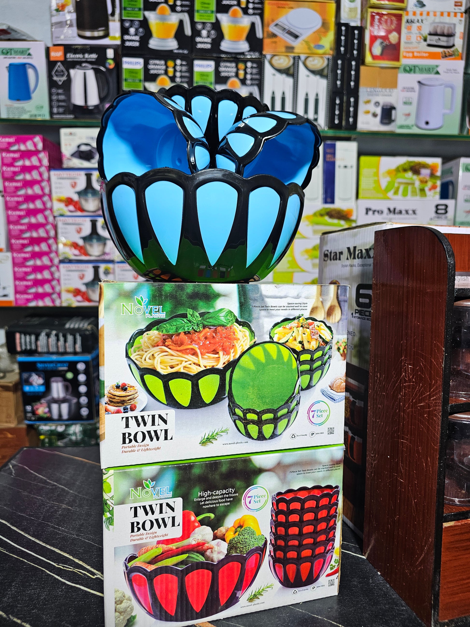 - 7-piece twin bowl set for fruits, salads, snacks, and serving